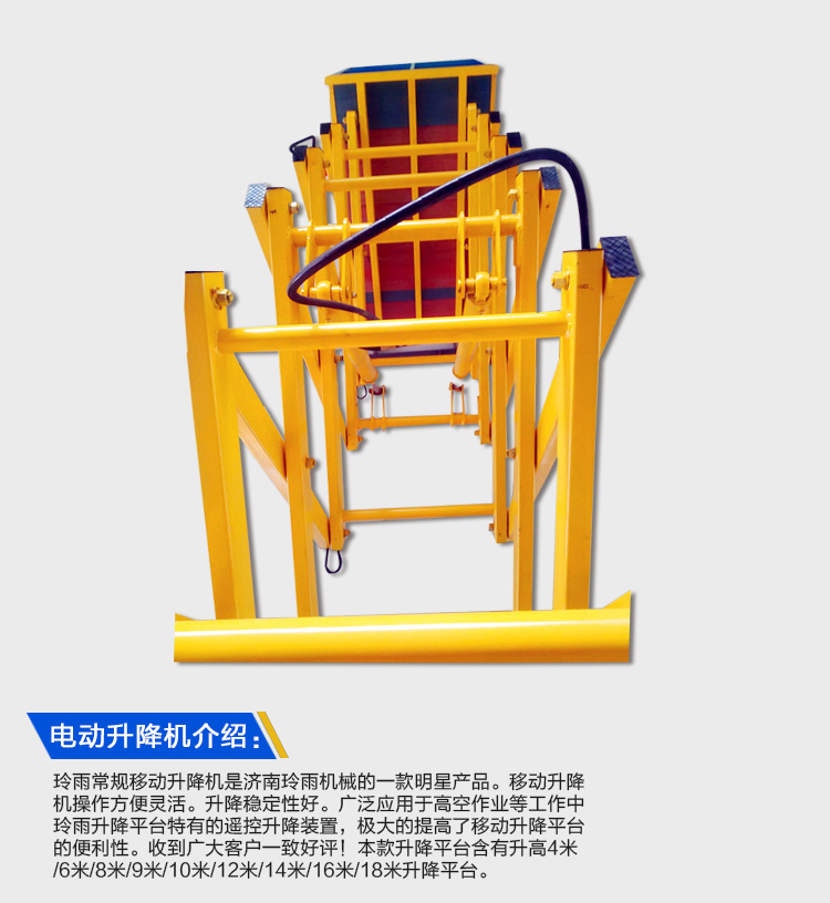 玲雨移動式液壓升降平臺此系列產(chǎn)品升降高度從4米到18米,荷載重量從300-1000公斤。升降方式可為手動式,電動式,電瓶式,柴油式,特殊場所也可選用防爆電器,還可以