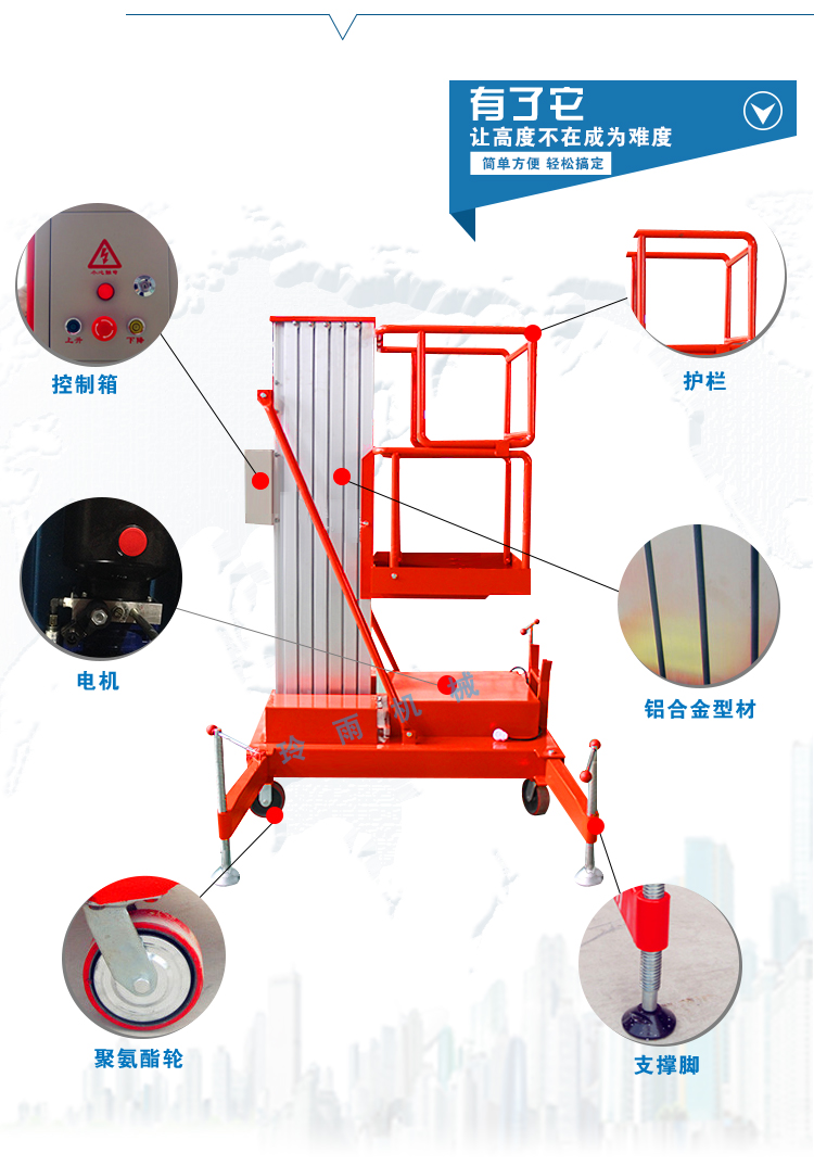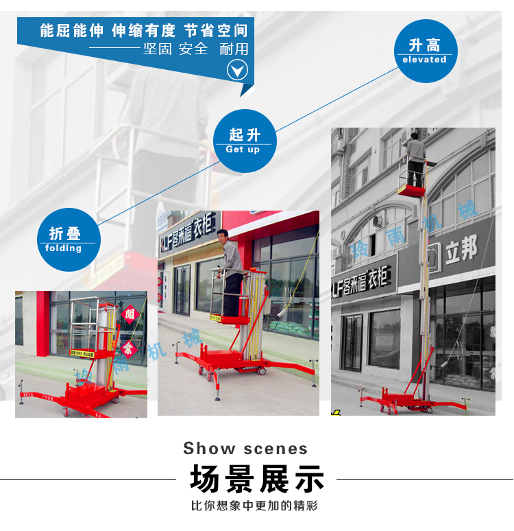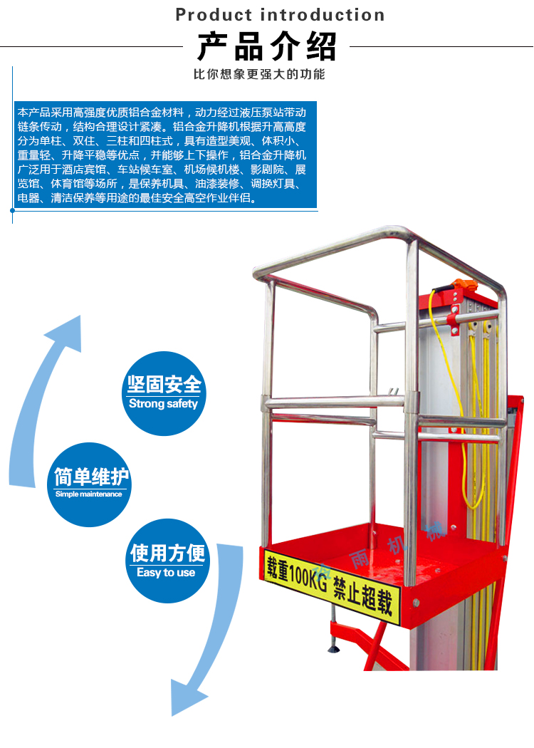 該系列產品主體結構采用高強度鋁合金型材料,動力源可為電動,手動電瓶或柴油機控制,還可以根據(jù)用戶需要裝遙控裝置,設備占用空間小,重量輕,可在各房間或樓梯口件隨意移動。外觀美觀,經久耐用,使用方便。