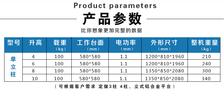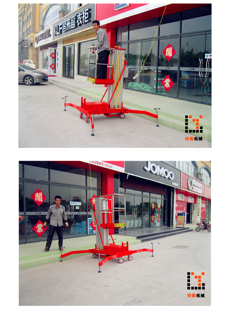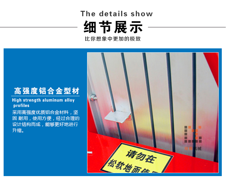 鋁合金升降機.主體結構采用高強度鋁合金型材料,動力源可為電動,手動電瓶或柴油機控制。技術參數(shù):